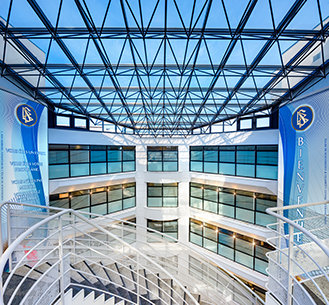 Sex våningar över receptionen tronar byggnadens praktfulla atrium. Designen inspirerades av sequoian, inklusive spiraltrappan kantad av ett intrikat bladmönster.